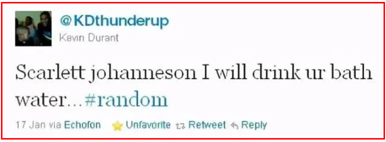 NBA巨星杜兰特曾公开表示:“我想喝斯嘉丽·约翰逊的洗澡水。”