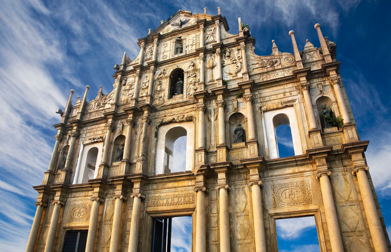 大三巴牌坊,其正式名称为圣保禄大教堂遗址,是澳门的标志性建筑物之一,2005年与澳门历史城区的其他文物成为联合国世界文化遗产。大三巴牌坊建筑糅合了欧洲文艺复兴时期与东方建筑的风格而成,体现出东西艺术的交融,雕刻精细,巍峨壮观。由三至五层构成三角金字塔形,无论是牌坊顶端高耸的十字架,还是铜鸽下面的圣婴雕像和被天使、鲜花环绕的圣母塑像,都充满着浓郁的宗教气氛,给人以美的享受。牌坊上各种雕像栩栩如生,堪称“立体的圣经”。