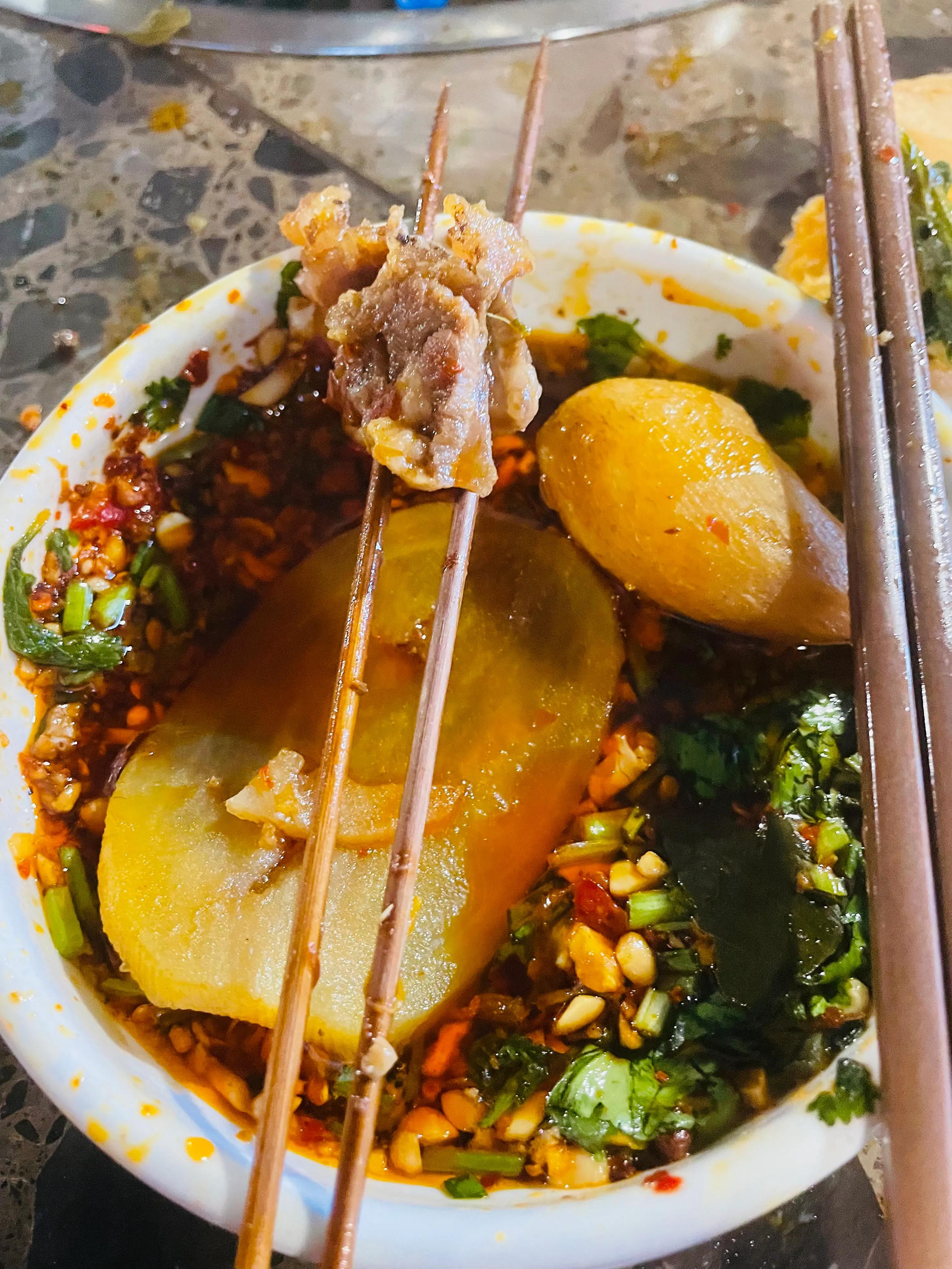 豆腐脑大约有十来种小菜及配料,相对而言老家的更显“寡淡”,但价格更加实惠;老家也流行吃钵钵鸡,更是藤椒味钵钵鸡的起源地,这里不作对比,各有特色。